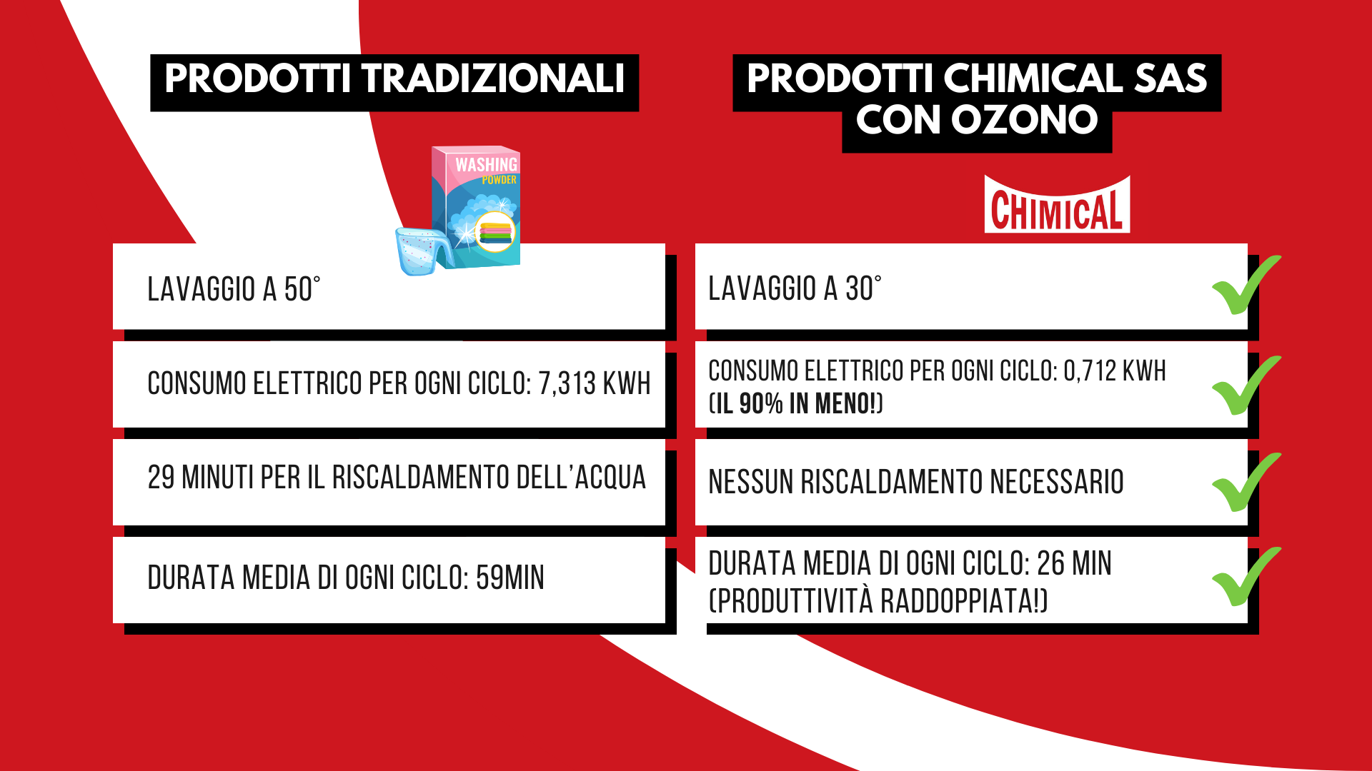 Ecco perché i lavaggi con i nostri prodotti assicurano una diminuzione fino al 50% della durata del processo di lavaggio, una riduzione fino al 90% del consumo di energia grazie al lavaggio completamente a freddo ed un risparmio fino al 40% di acqua nel processo di lavaggio garantendo un risultato impeccabile.